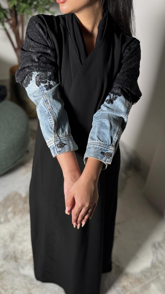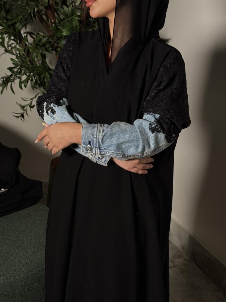 عبايه باكمام دمج مابين الدانتيل والجينز